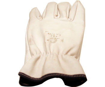 Luva confeccionada em vaqueta, reforço no polegar, indicador e na palma, com elástico de ajuste no dorso e acabamento em viés com fechamento através de costuras.